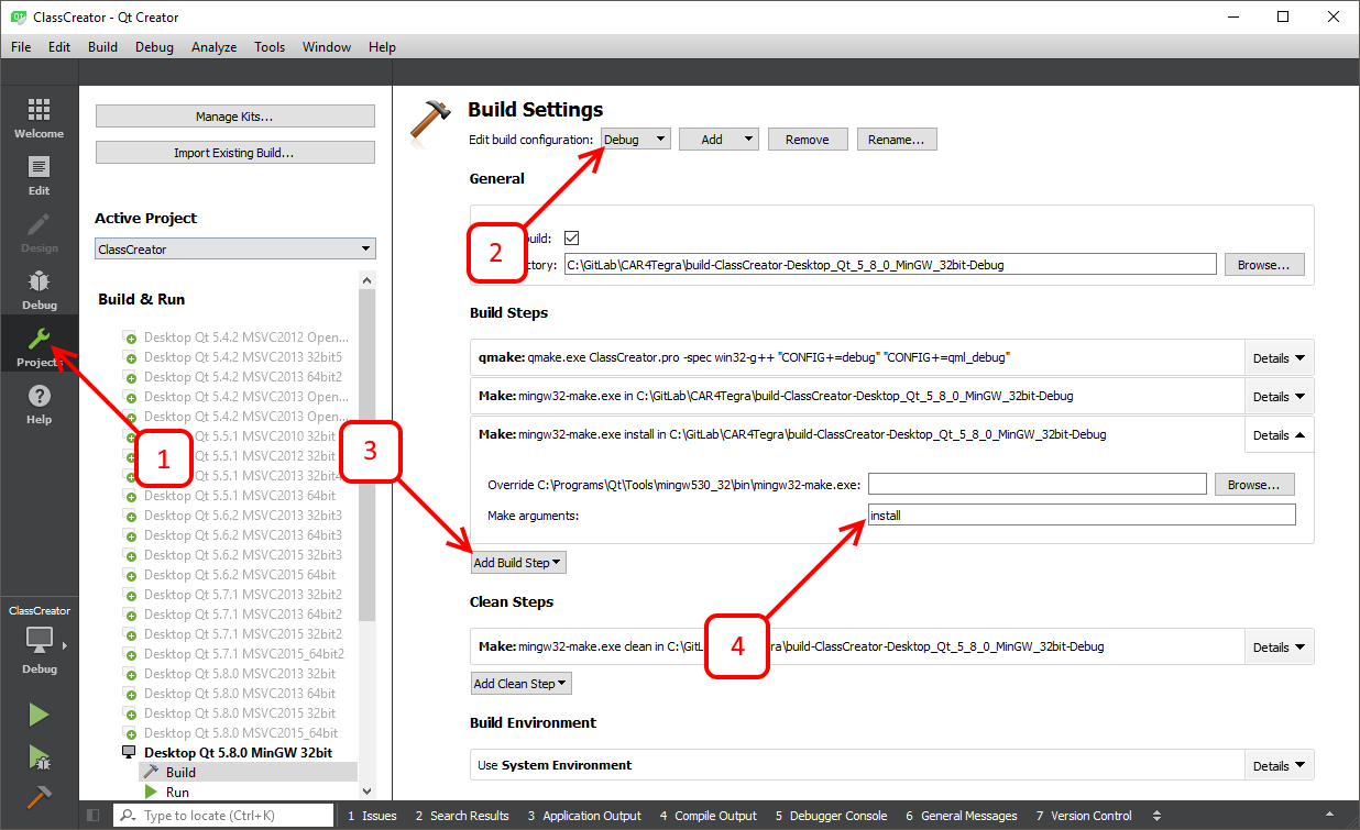 To automatically copy the template directory to the build directory an additional building step has to be added in Qt Creator: